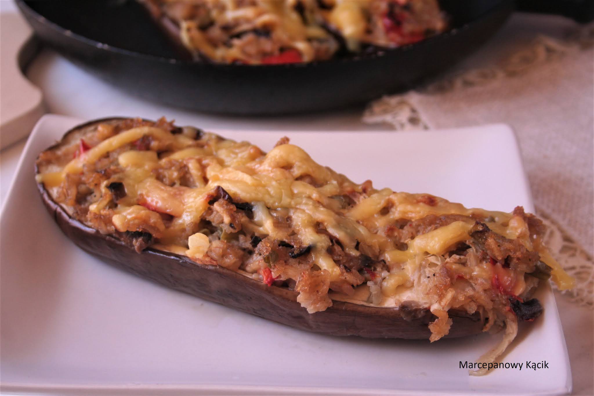 Bakłażany przeciąć na połówki, lekko wydrążyć środki, posolić i posmarować oliwką. Nałożyć farsz i piec w piekarniku w 180* przez 20 minut. Po tym czasie posypać startym serem i w dalszym ciągu piec już tylko przez pięć minut. Wyłączyć grzanie, bakłażany potrzymać jeszcze w piekarniku ok. 5 minut.